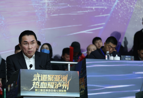 国际奥委会名誉委员、中国奥委会副主席于再清、亚洲奥林匹克理事会副主席宋鲁增、国家体育总局武术运动管理中心主任张玉萍、国际MMA联合会主席/亚洲奥林匹克理事会副主席/亚洲综合武道协会主席唐逸刚、中共泸州市委书记刘筱柳、四川省体育局副局长陈兴东、四川体育职业学院院长刘汉权、泸州市人民政府副市长靳地胜、亚洲综合武道协会秘书长陈立生等领导嘉宾齐聚泸州,与各国裁判员、教练员、运动员代表、及媒体朋友见证这一重要时刻。