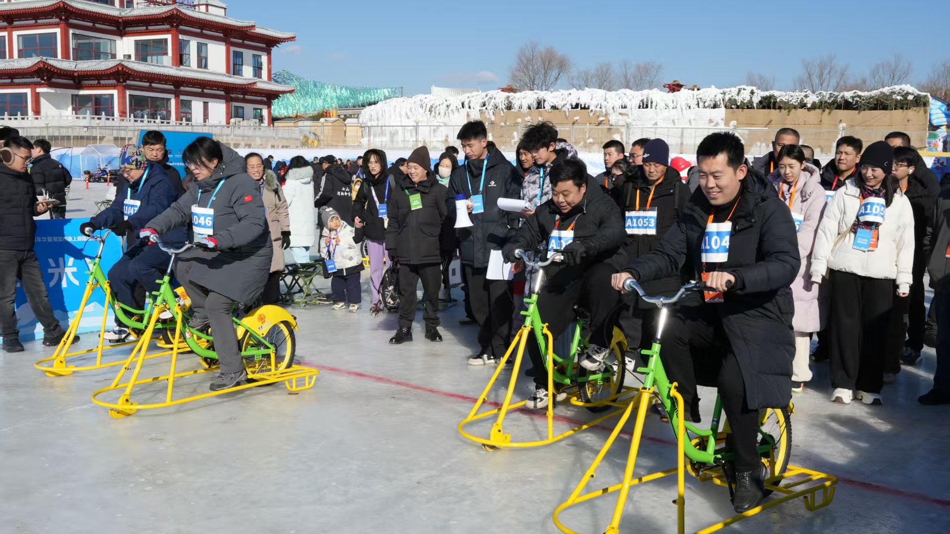 活动现场,涞源湖冰面平整如镜,欢声笑语此起彼伏。冰上自行车极速挑战赛中,选手于百米冰道疾驰竞速;冰上爬犁竞速展现技巧与平衡;四人滚冰轮胎接力、冰上拔河等团队项目凝聚协作精神,呐喊助威声不绝于耳;零基础友好的趣味冰壶赛配备专业指导员现场教学,银发长者与稚龄孩童同场体验策略博弈之趣;全天开放的自由嬉冰区配备冰车、爬犁等设备,安全员全程巡视引导,成为家庭亲子互动的温馨乐园。